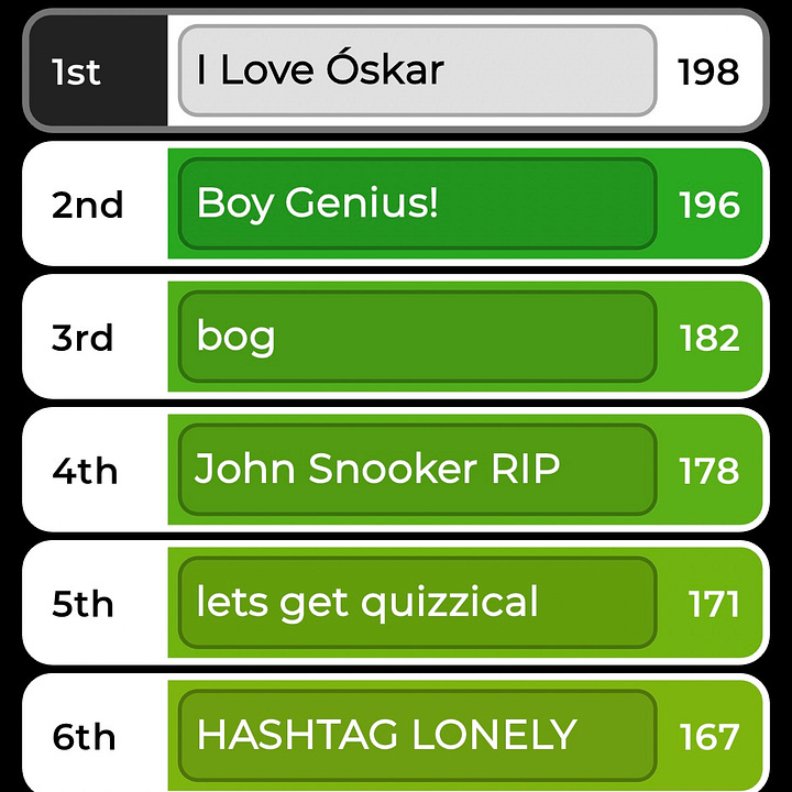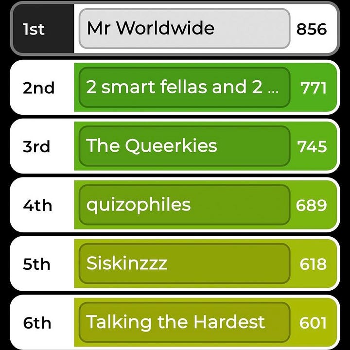 Finally won my two weekly pub quizzes so I can die happy. Excited to be back in the bottom half next week!